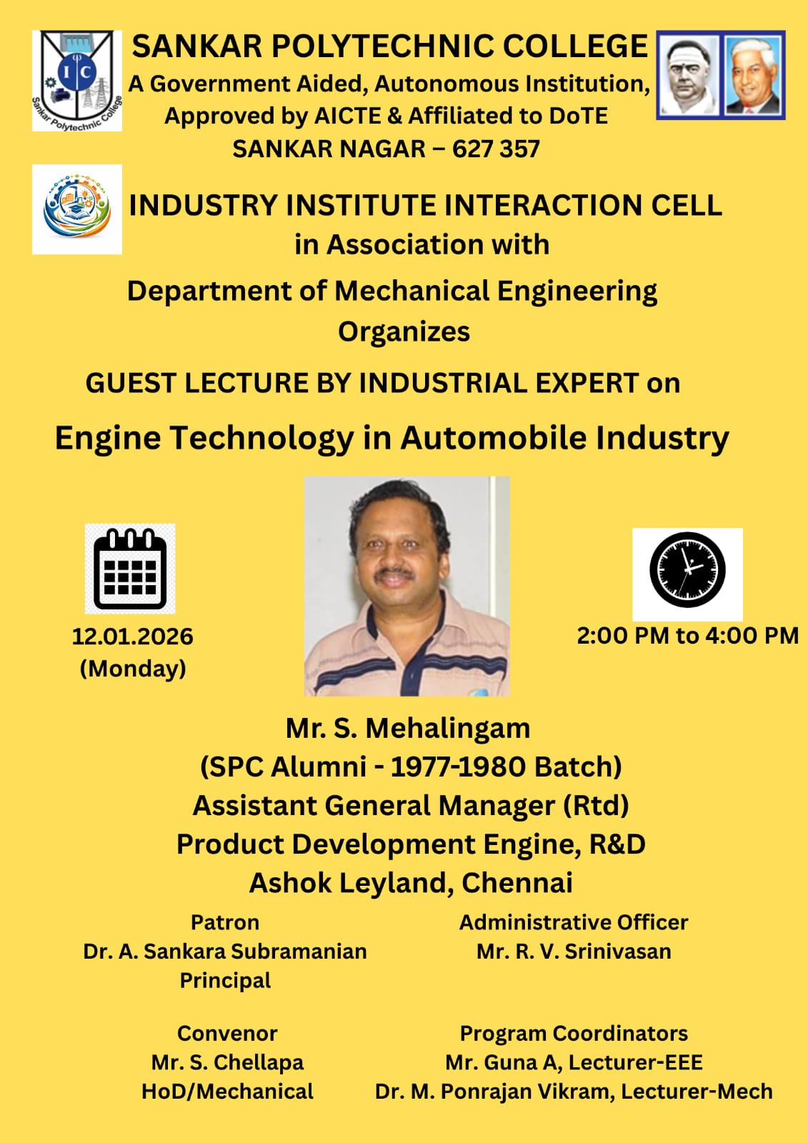 We're thrilled to announce a special guest lecture on "Engine Technology in Automobile Industry" organized by our Industry Institute Interaction Cell in association with the Department of Mechanical Engineering.