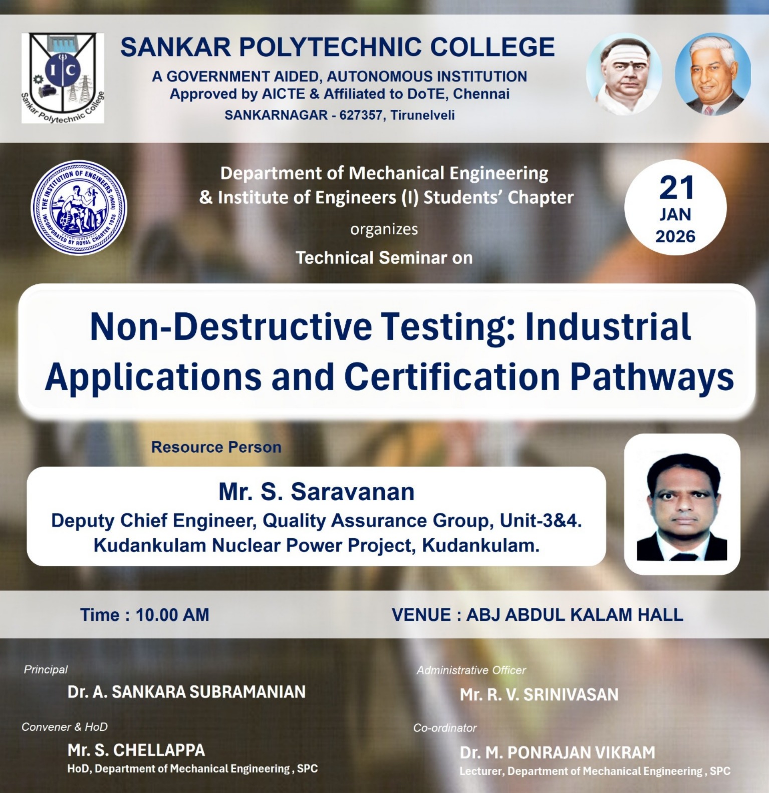 The Department of Mechanical Engineering & Institute of Engineers (I) Students' Chapter at Sankar Polytechnic College is proud to organize a Technical Seminar on "Non-Destructive Testing: Industrial Applications and Certification Pathways"
