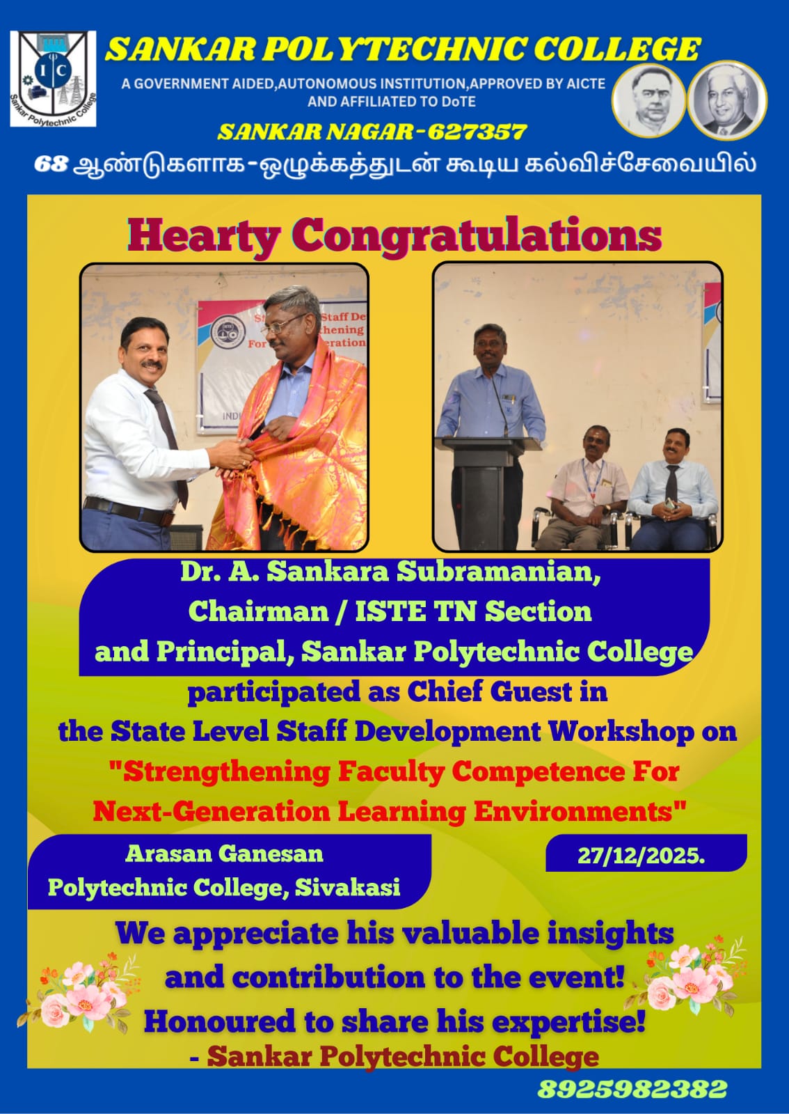 We are delighted to share that Dr. A. Sankara Subramanian, Chairman/ISTE TN Section and Principal of Sankar Polytechnic College, served as the Chief Guest at the State Level Staff Development Workshop on "Strengthening Faculty Competence For Next-Generation Learning Environments" held at Arasan Ganesan Polytechnic College, Sivakasi on December 27, 2025.