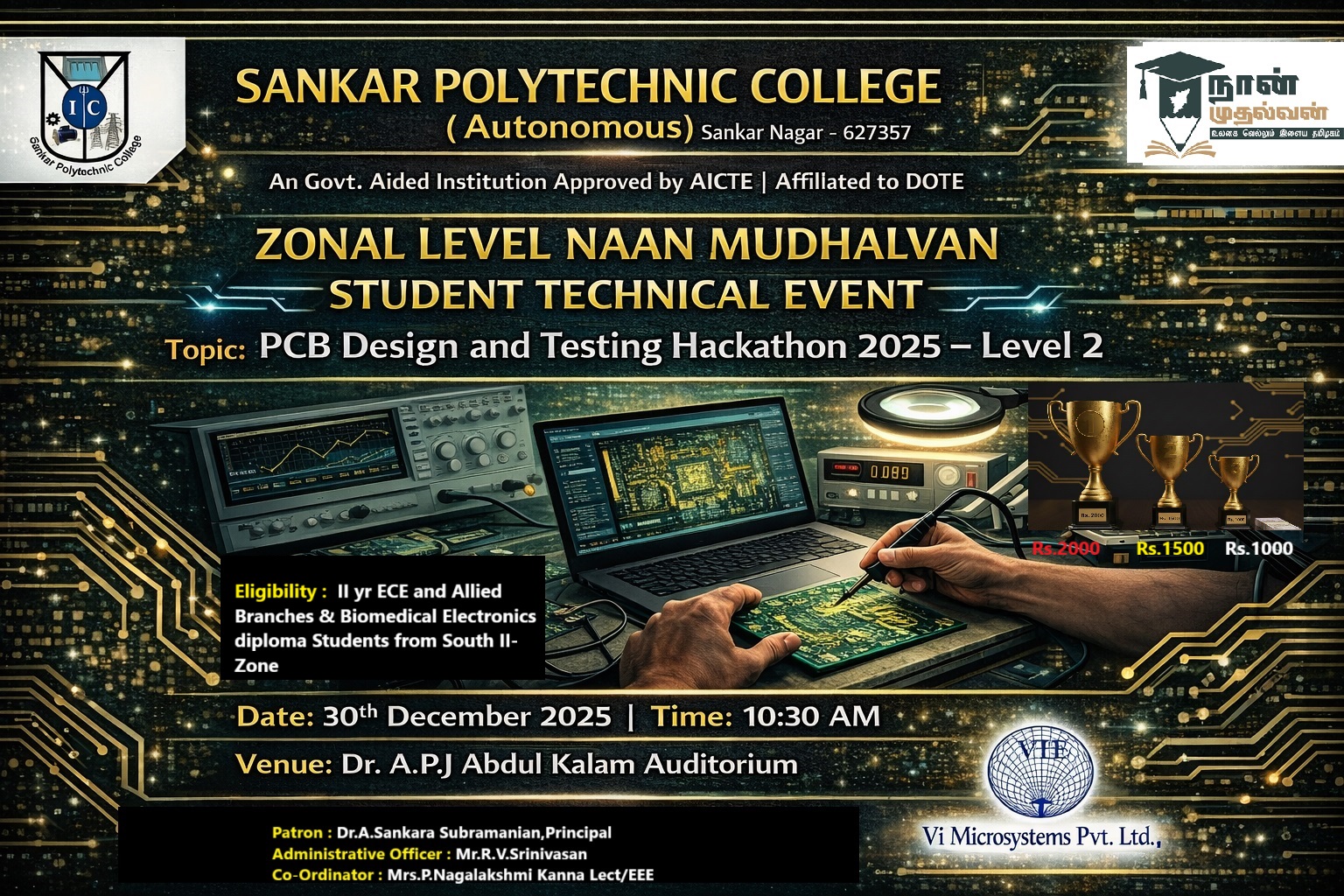 Sankar Polytechnic College (Autonomous) is proud to announce our Zonal Level Naan Mudhalvan Student Technical Event - a cutting-edge PCB Design and Testing Hackathon 2025 - Level 2!