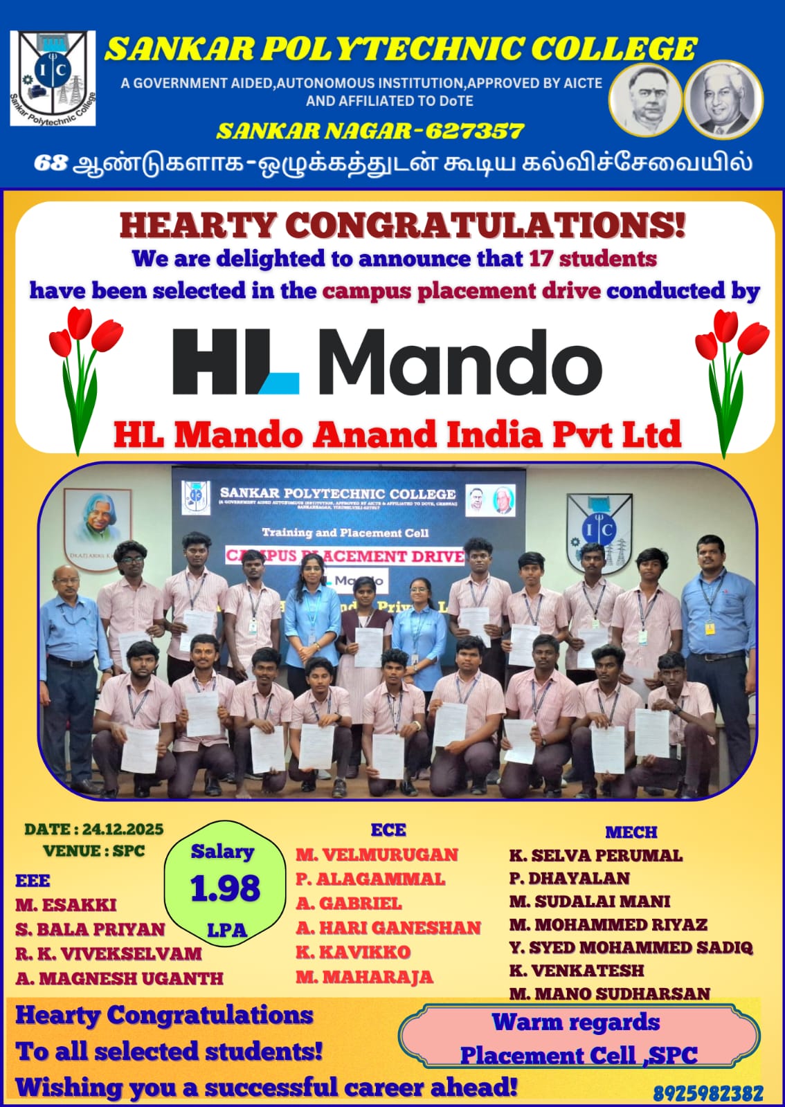 We are thrilled to announce that 17 talented students from our ECE, EEE, and MECH departments have been successfully selected in the campus placement drive conducted by HL Mando Anand India Pvt Ltd on December 24, 2025!