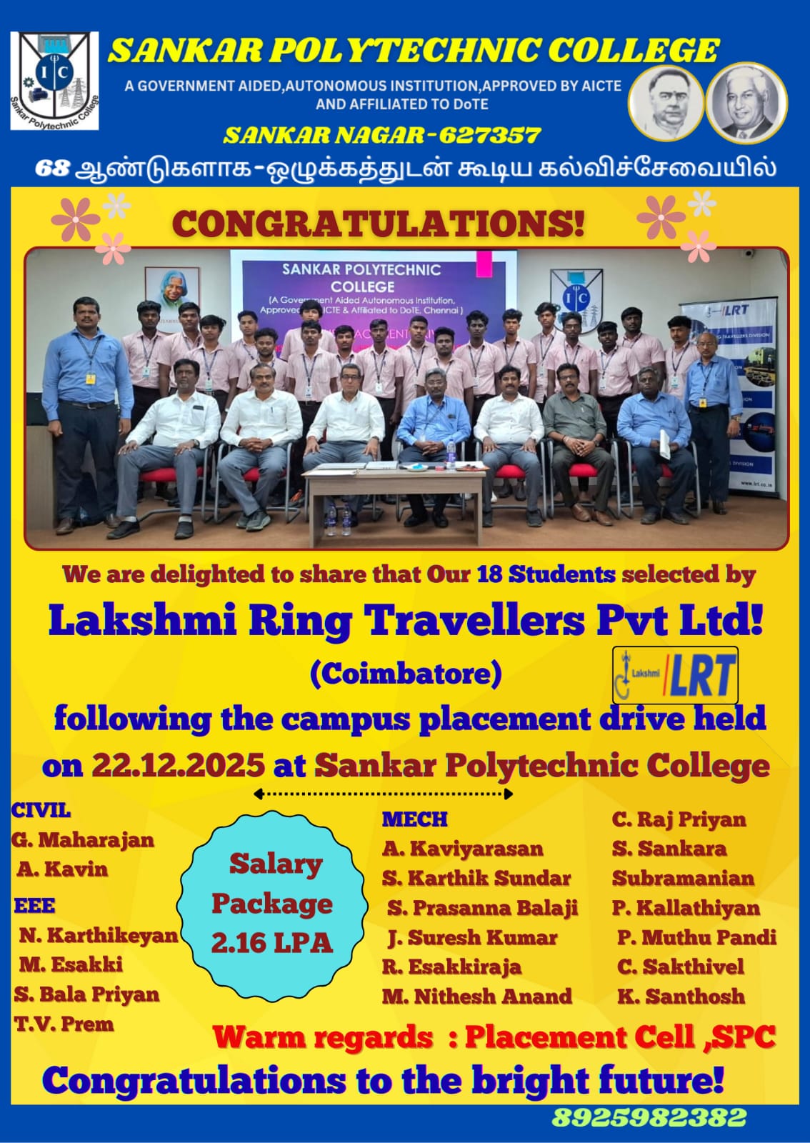 We are thrilled to announce that 18 talented students from Sankar Polytechnic College have been successfully selected by Lakshmi Ring Travellers Pvt Ltd (LRT), Coimbatore!