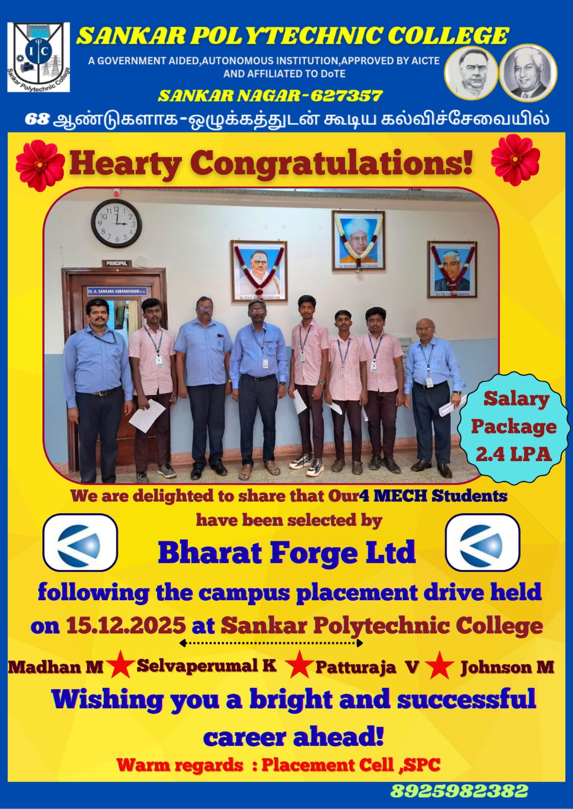 We are delighted to announce that 4 Mechanical Engineering students from Sankar Polytechnic College have been successfully placed at Bharat Forge Ltd with an attractive salary package of 2.4 LPA! 🌟