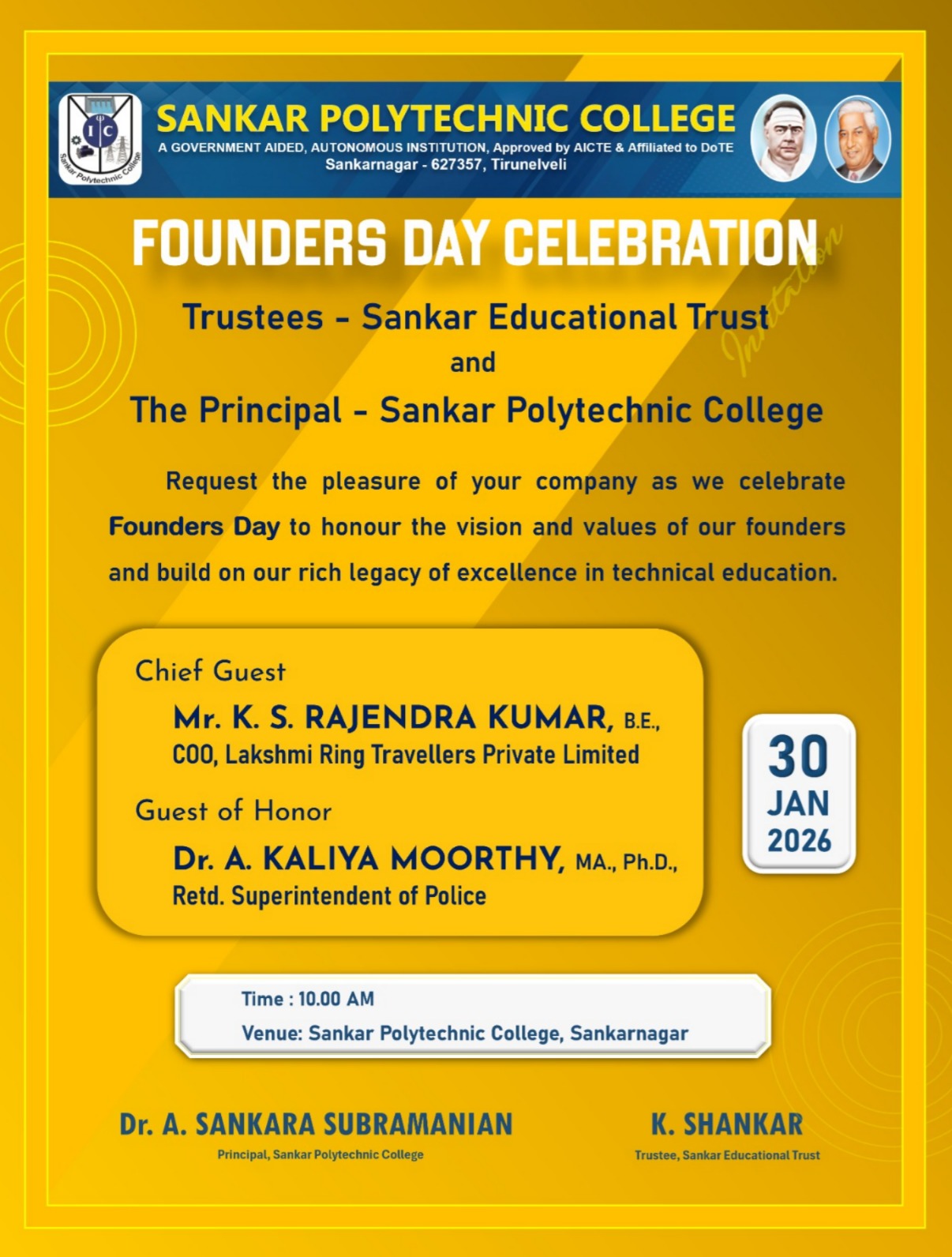 Sankar Polytechnic College proudly invites you to join us as we honor the vision and values of our founders on January 30th, 2026 at 10:00 AM.